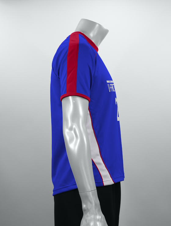 背面から前面にかけて、サイドに入った切り込みが特徴的なバレーボールユニフォームシャツです。滑らかなカーブを描いたサイドの切り込みは、体を引き締まった印象に見せる効果があります。ボディと肩、サイドの切り込みの境目は丁寧にパイピング処理しました。