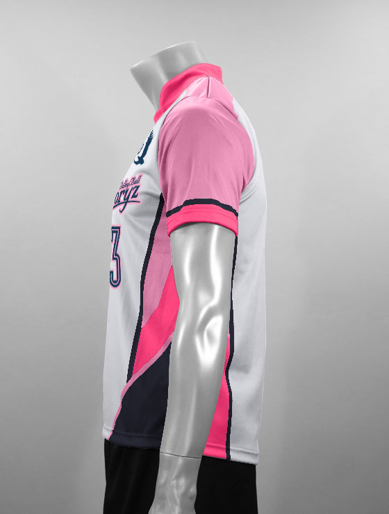 切れ込むような直線的なラインが力強い印象を与えるバレーボールユニフォームシャツにスポーティーなプリントを配置しました。VプレミアリーグのNECレッドロケッツや、VチャレンジリーグⅡのブレス浜松を思わせるプロっぽいデザインが特徴的です。